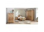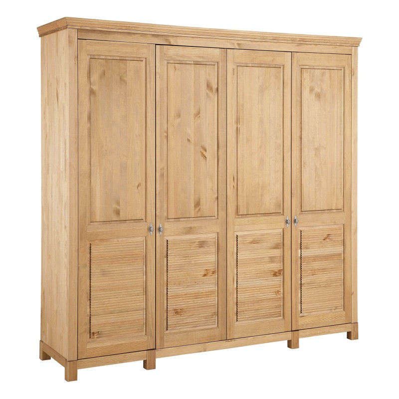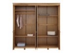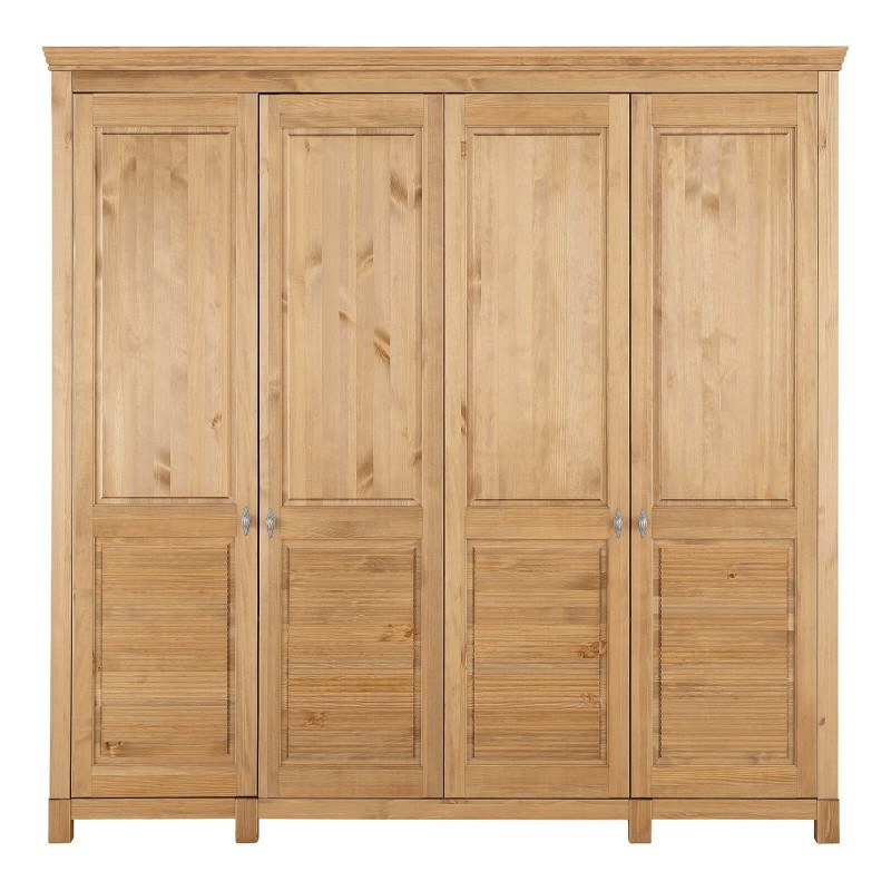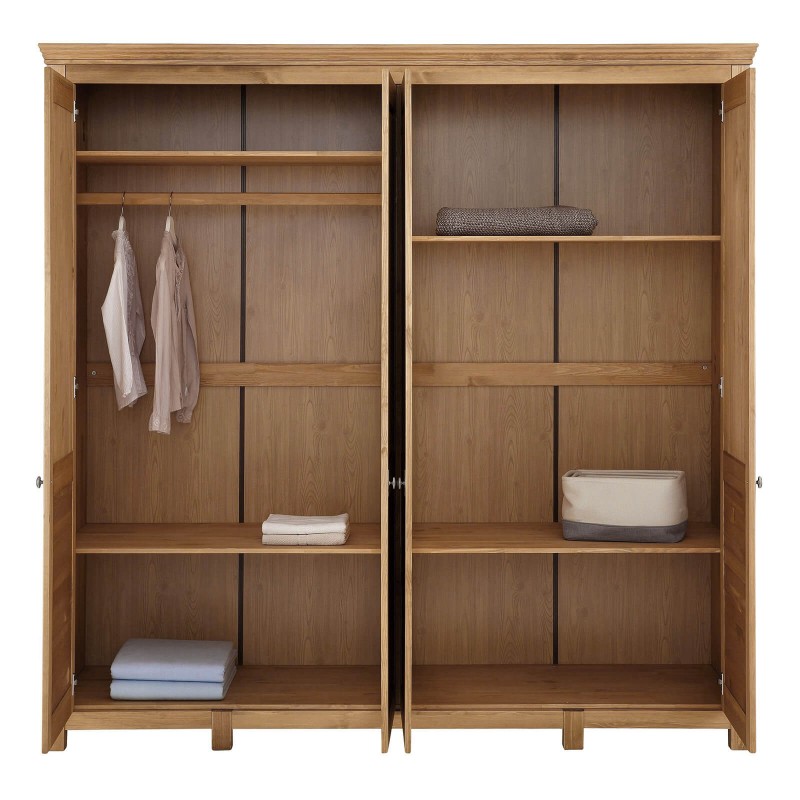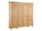 Это большой четырехдверный шкаф для внушительного гардероба! Внутри широкое отделение со штангой и местом под головные уборы, а также четыре вместительные полки для других вещей. Распашные двери – глухие, но с оригинальным декором. Завершает картину эффектная фурнитура “под старину”.