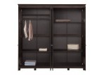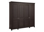 Это большой четырехдверный шкаф для внушительного гардероба! Внутри широкое отделение со штангой и местом под головные уборы, а также четыре вместительные полки для других вещей. Распашные двери – глухие, но с оригинальным декором. Завершает картину эффектная фурнитура “под старину”.