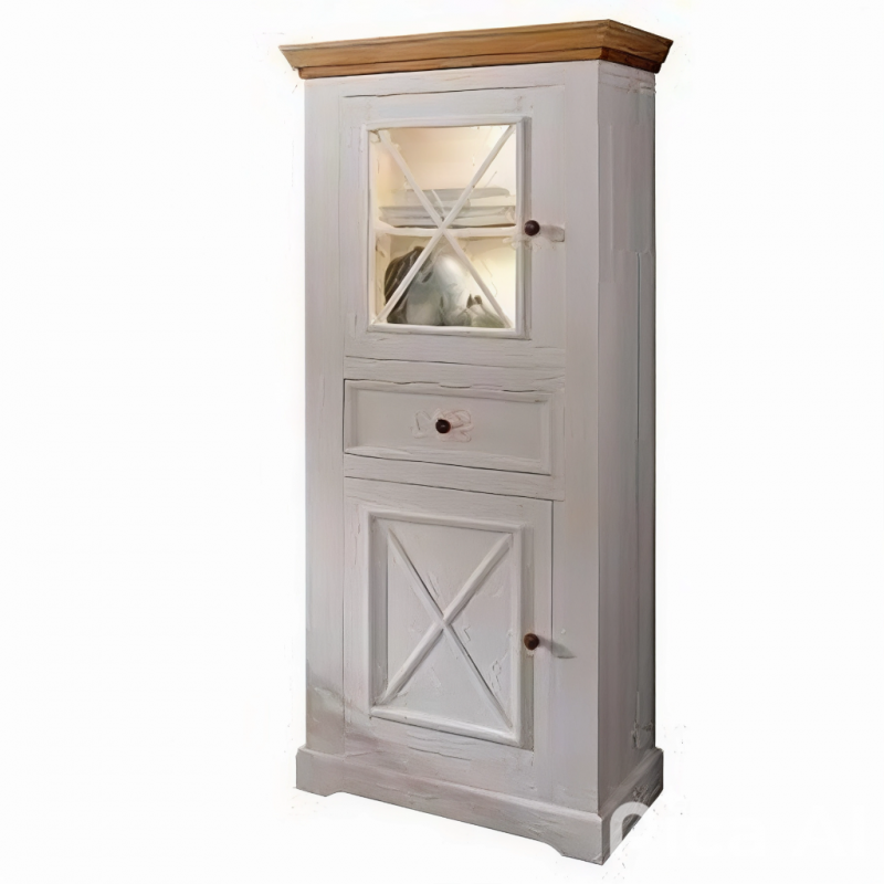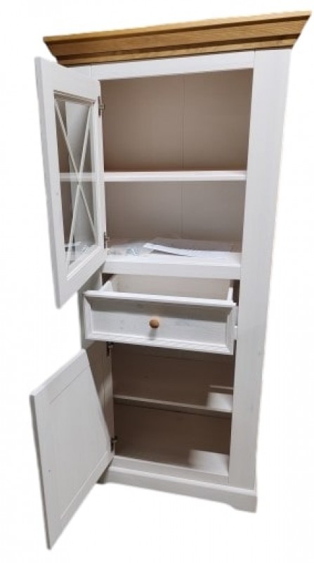 Шкаф имеет один выдвижной ящик на роликовых направляющих, две дверки, за каждой дверкой деревянная полка.