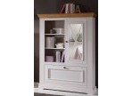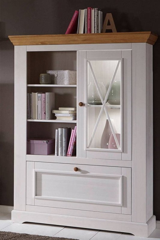 Тумба имеет нишу с полками, стеклянную дверь и откидную дверь.