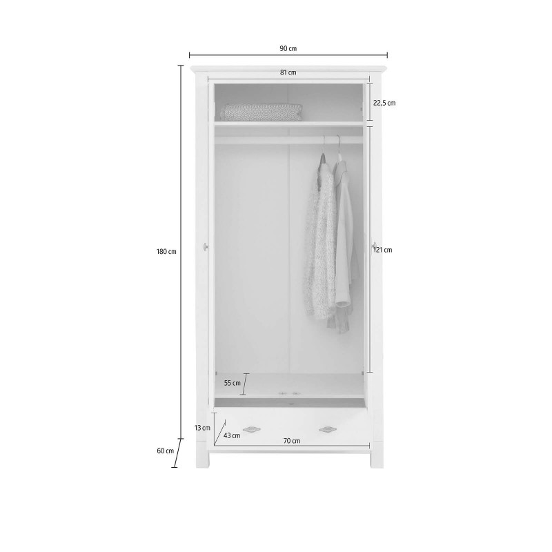 Шкаф оснащен штангой для верхней одежды, полкой для шляпы и выдвижным ящиком.