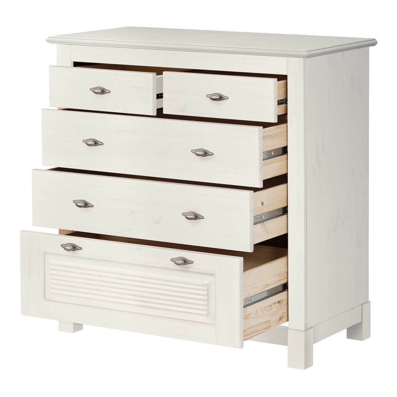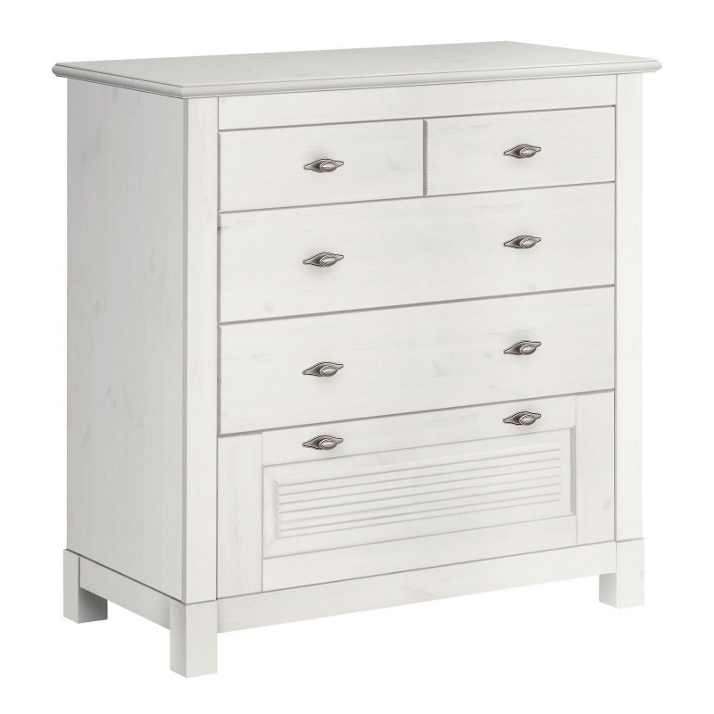 Комоды из коллекции «Рауна» отличаются простым и функциональным дизайном. Эту модель будет хорошо смотреть в спальне, гостиной или просторной прихожей. Три больших ящика и два для повседневных вещей. Удобная поверхность позволит вам ссылаться на сувениры, фотографии и другие необходимые вещи.