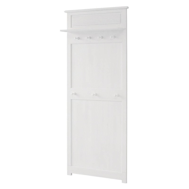 Белая вешалка 200 из коллекции “Рауна” идеально вписывается в современный скандинавский интерьер. Состоит из трех секций: верхняя полочка для головных уборов, под ней 4 крючка для одежды, еще ниже - три для сумок. Широкая планка из натурального дерева надежно защищает стену от грязи и сырости.