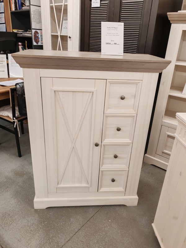 Тумба имеет четыре выдвижных ящика на роликовых направляющих и одну дверь, за которой находятся 2 деревянные полки. Возможно комплектация с шариковыми направляющими полного выката.